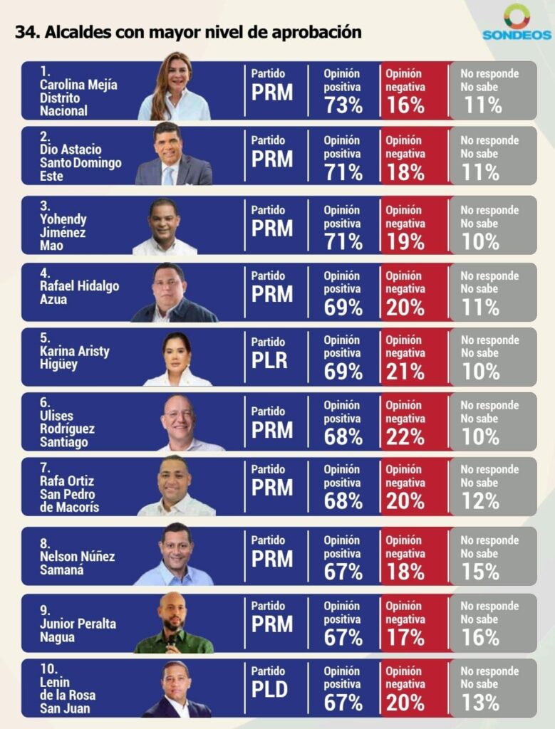Santo Domingo, DN – Carolina Mejía figura con el mayor nivel de aprobación entre todos los alcaldes de República Dominicana, tras encabezar ese ranking con 73 por ciento de opinión positiva en una reciente encuesta realizada por Sondeos.
