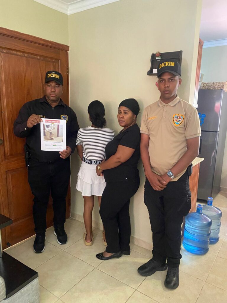 La Dirección Central de Investigación (DICRIM), a través del Departamento de Búsqueda de Personas Desaparecidas, localizó sana y salva a una adolescente de 15 años que había sido reportada como desaparecida desde el pasado 1 de noviembre del presente año, en el sector Los Rieles, municipio Los Alcarrizos, provincia Santo Domingo.