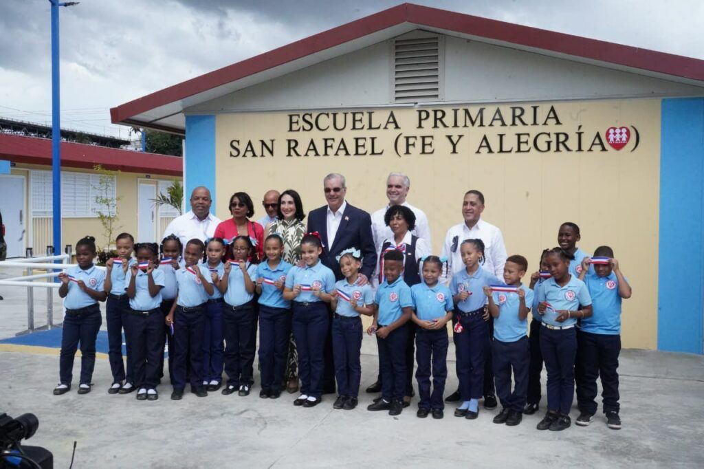 Distrito Nacional. – Con gran entusiasmo y orgullo, decenas de estudiantes del sector Los Guandules recibieron al presidente Luis Abinader, quien, junto al ministro de Educación Luis Miguel De Camps, encabezó la inauguración de la Escuela Básica San Rafael (Fe y Alegría) ubicada en Domingo Savio.