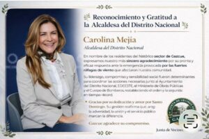 Santo Domingo, DN – La Junta de Vecinos de Gazcue agradeció a Carolina Mejía por su pronta y eficaz respuesta tras el sector ser impactado por fuertes vientos que afectaron decenas de árboles el pasado lunes.
